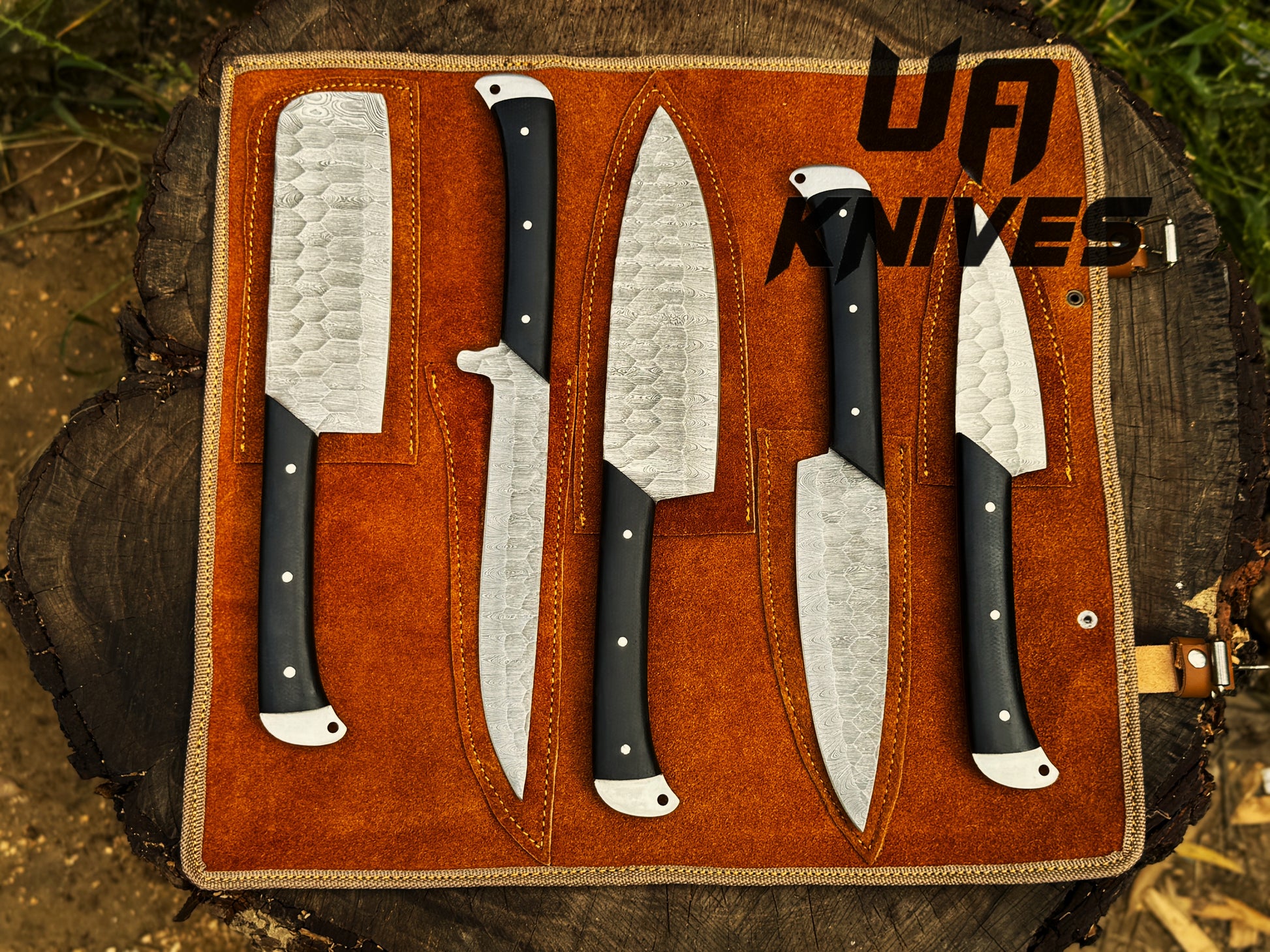 UA Midnight Forge - Handmade Damascus Steel Full Tang 5 pcs BBQ Chef Set with Genuine Leather Bag